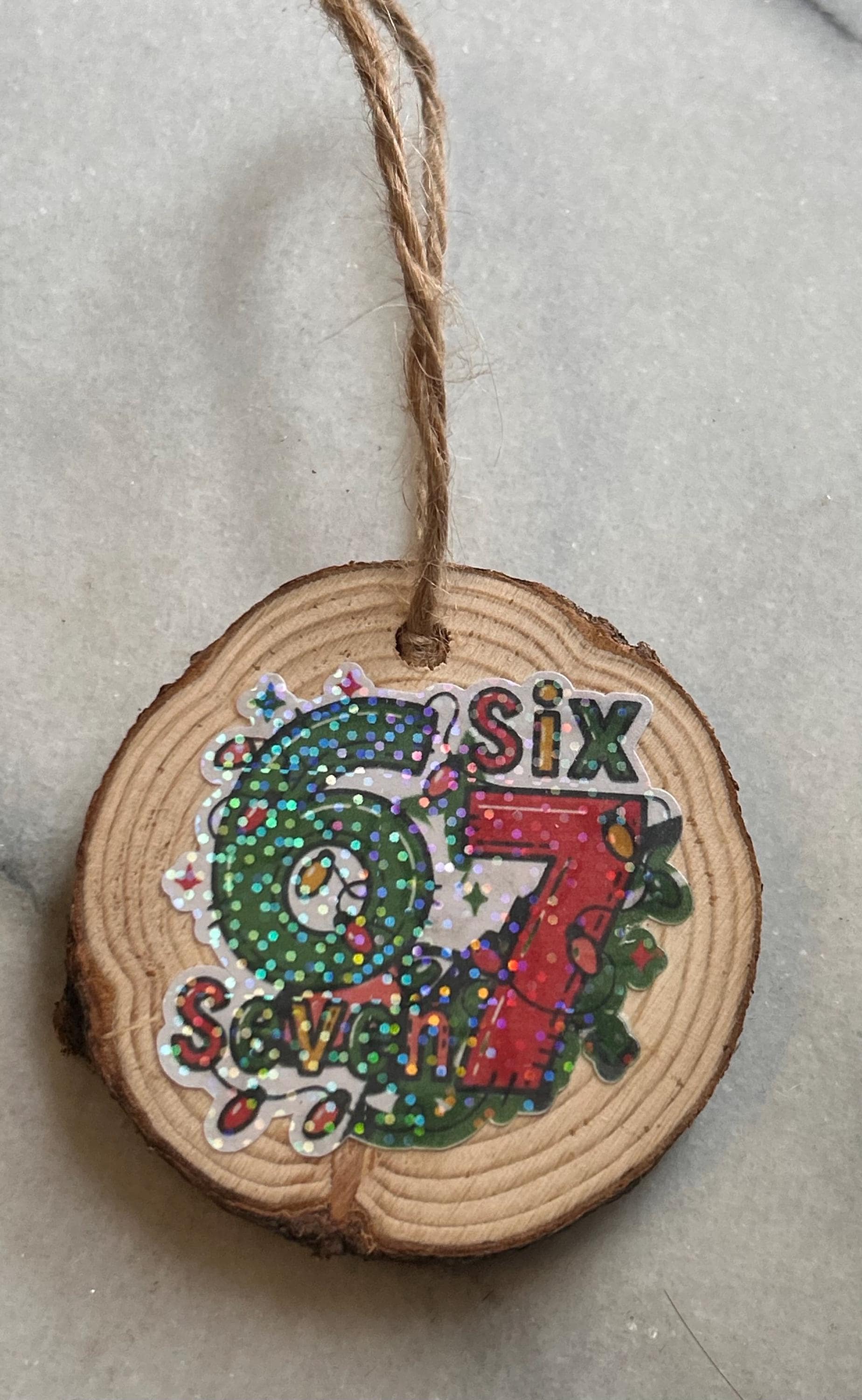 This ornament is printed on paper then has a holographic cover on a wood slice with twine